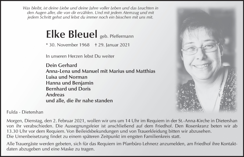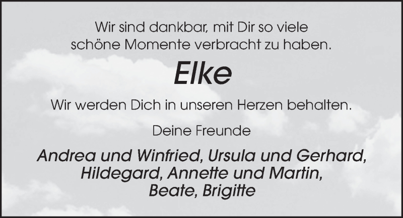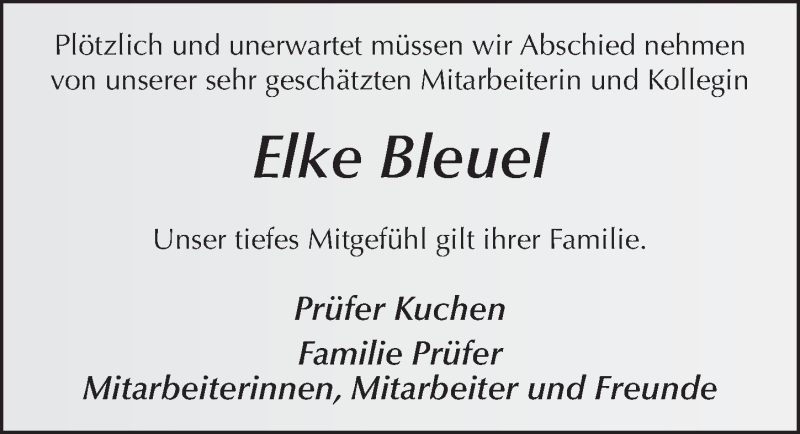 Hier finden Sie alle Traueranzeigen aus der Zeitung, die bisher für Elke Bleuel erschienen sind. Weitere Traueranzeigen, die in der Zeitung erscheinen, werden hier ebenfalls aufgelistet