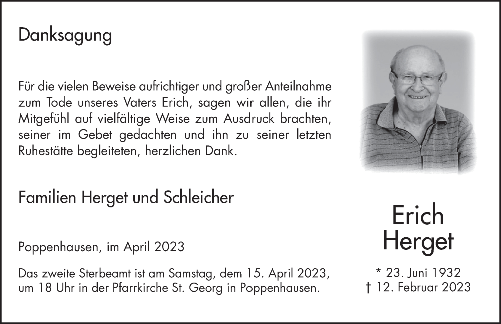 Hier finden Sie alle Traueranzeigen aus der Zeitung, die bisher für Erich Herget erschienen sind. Weitere Traueranzeigen, die in der Zeitung erscheinen, werden hier ebenfalls aufgelistet
