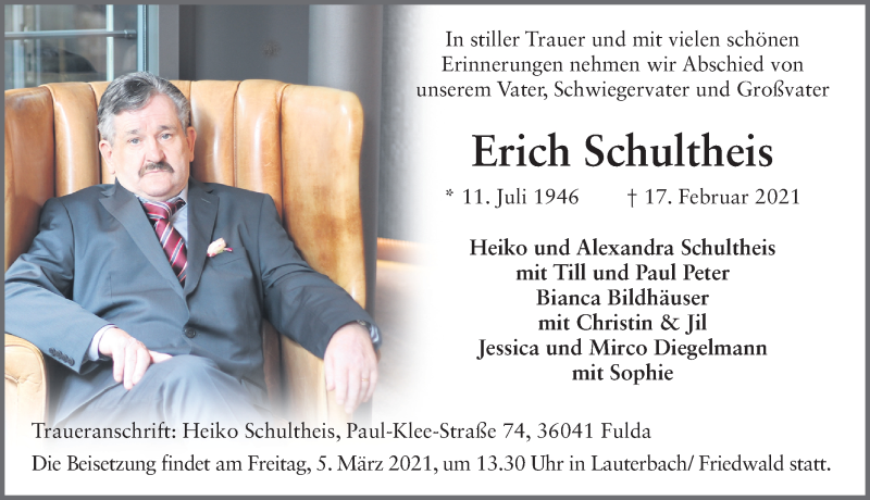 Hier finden Sie alle Traueranzeigen aus der Zeitung, die bisher für Erich Schultheis erschienen sind. Weitere Traueranzeigen, die in der Zeitung erscheinen, werden hier ebenfalls aufgelistet