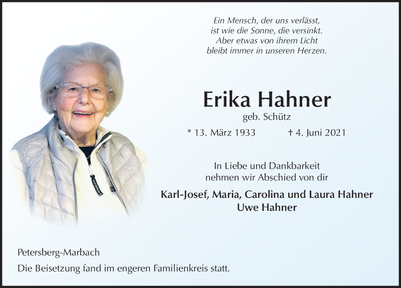Hier finden Sie alle Traueranzeigen aus der Zeitung, die bisher für Erika Hahner erschienen sind. Weitere Traueranzeigen, die in der Zeitung erscheinen, werden hier ebenfalls aufgelistet