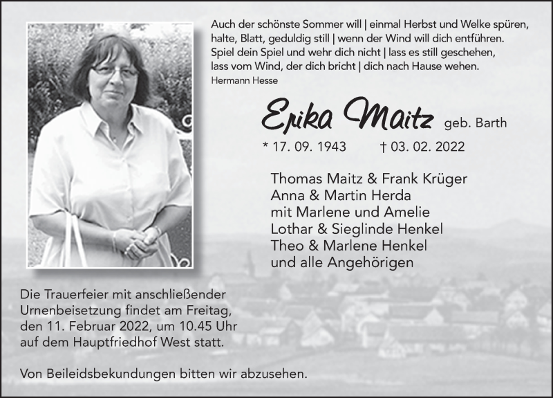 Hier finden Sie alle Traueranzeigen aus der Zeitung, die bisher für Erika Maitz erschienen sind. Weitere Traueranzeigen, die in der Zeitung erscheinen, werden hier ebenfalls aufgelistet