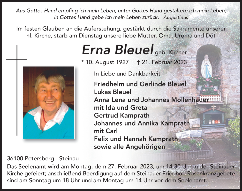 Hier finden Sie alle Traueranzeigen aus der Zeitung, die bisher für Erna Bleuel erschienen sind. Weitere Traueranzeigen, die in der Zeitung erscheinen, werden hier ebenfalls aufgelistet