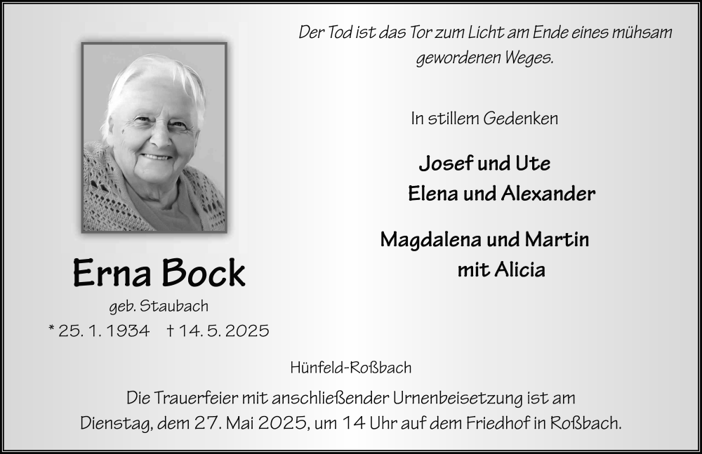 Hier finden Sie alle Traueranzeigen aus der Zeitung, die bisher für Erna Bock erschienen sind. Weitere Traueranzeigen, die in der Zeitung erscheinen, werden hier ebenfalls aufgelistet