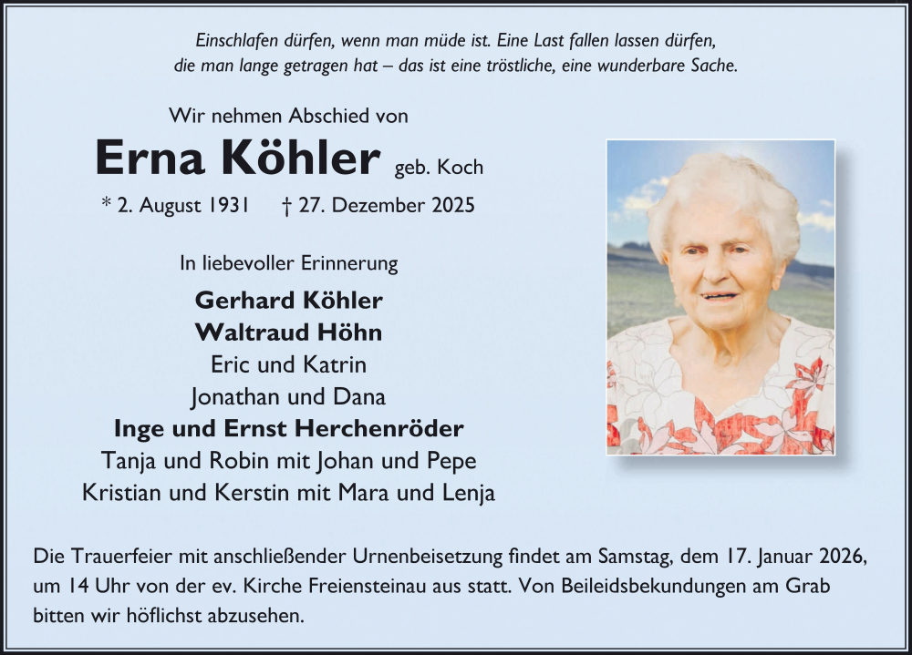 Hier finden Sie alle Traueranzeigen aus der Zeitung, die bisher für Erna Köhler erschienen sind. Weitere Traueranzeigen, die in der Zeitung erscheinen, werden hier ebenfalls aufgelistet