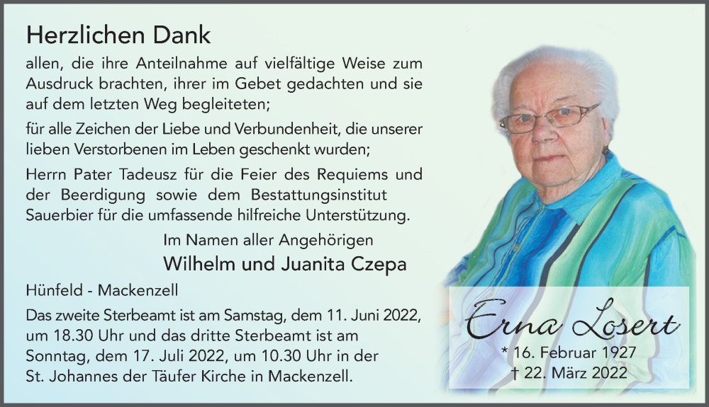Hier finden Sie alle Traueranzeigen aus der Zeitung, die bisher für Erna Losert erschienen sind. Weitere Traueranzeigen, die in der Zeitung erscheinen, werden hier ebenfalls aufgelistet