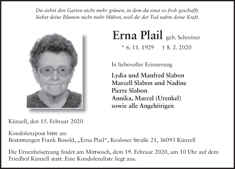 Hier finden Sie alle Traueranzeigen aus der Zeitung, die bisher für Erna Plail erschienen sind. Weitere Traueranzeigen, die in der Zeitung erscheinen, werden hier ebenfalls aufgelistet