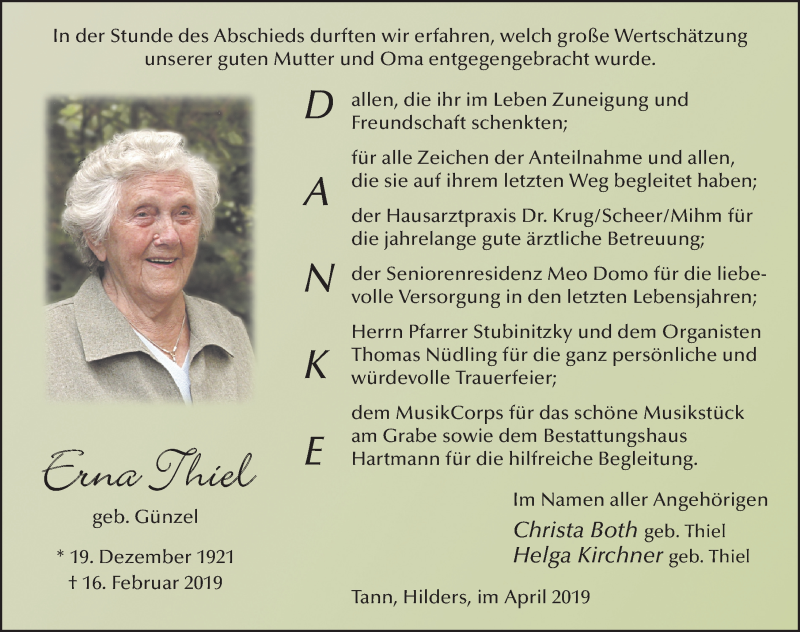 Hier finden Sie alle Traueranzeigen aus der Zeitung, die bisher für Erna Thiel erschienen sind. Weitere Traueranzeigen, die in der Zeitung erscheinen, werden hier ebenfalls aufgelistet