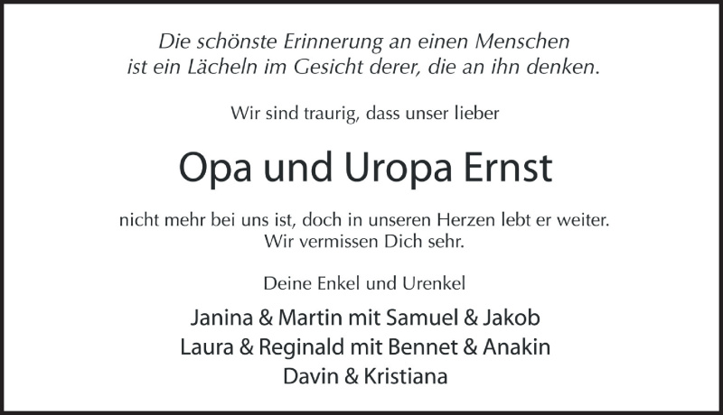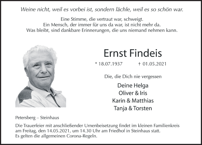 Hier finden Sie alle Traueranzeigen aus der Zeitung, die bisher für Ernst Findeis erschienen sind. Weitere Traueranzeigen, die in der Zeitung erscheinen, werden hier ebenfalls aufgelistet