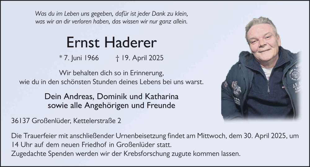 Hier finden Sie alle Traueranzeigen aus der Zeitung, die bisher für Ernst Haderer erschienen sind. Weitere Traueranzeigen, die in der Zeitung erscheinen, werden hier ebenfalls aufgelistet