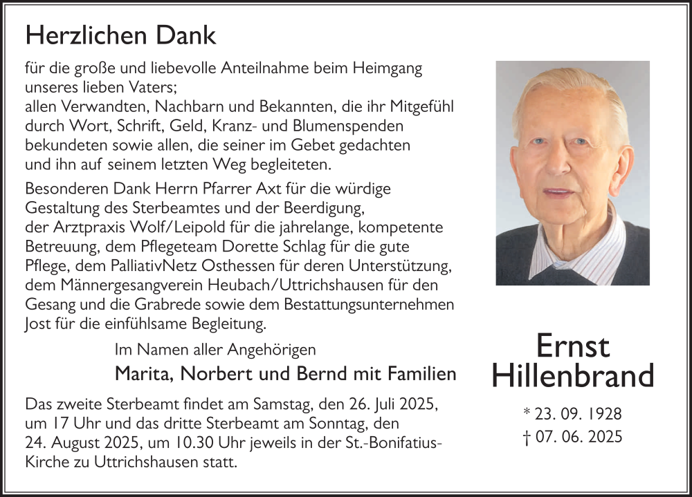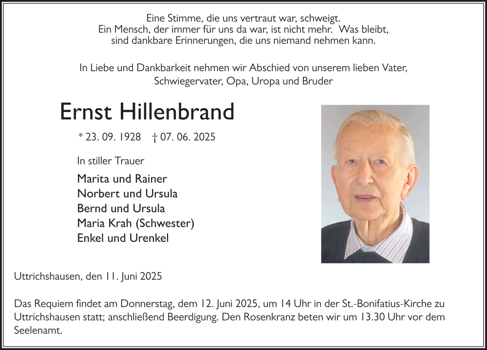 Hier finden Sie alle Traueranzeigen aus der Zeitung, die bisher für Ernst Hillenbrand erschienen sind. Weitere Traueranzeigen, die in der Zeitung erscheinen, werden hier ebenfalls aufgelistet