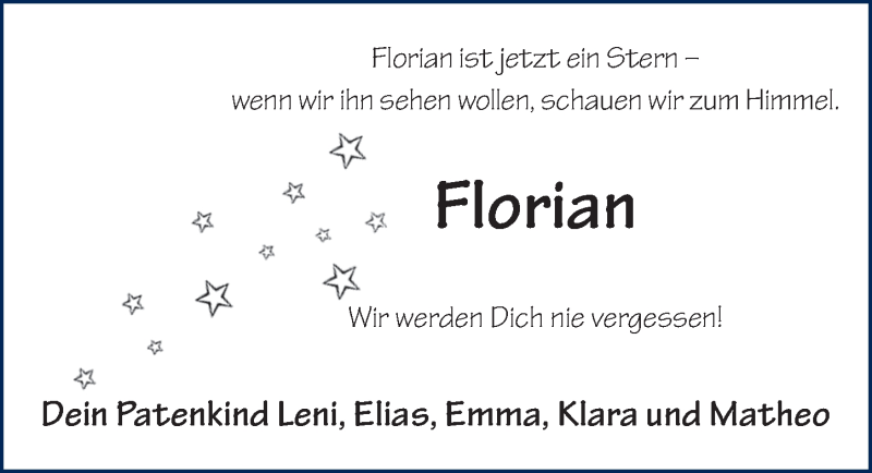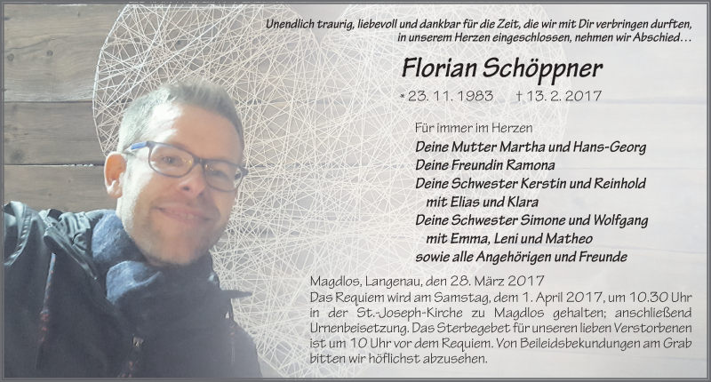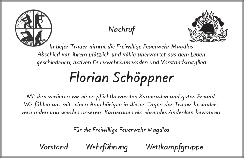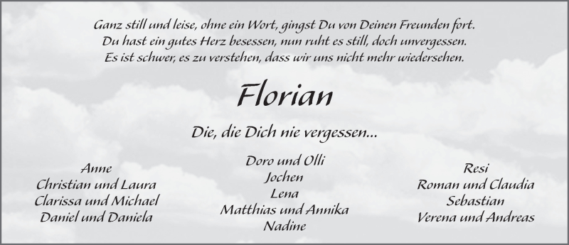 Hier finden Sie alle Traueranzeigen aus der Zeitung, die bisher für Florian Schöppner erschienen sind. Weitere Traueranzeigen, die in der Zeitung erscheinen, werden hier ebenfalls aufgelistet