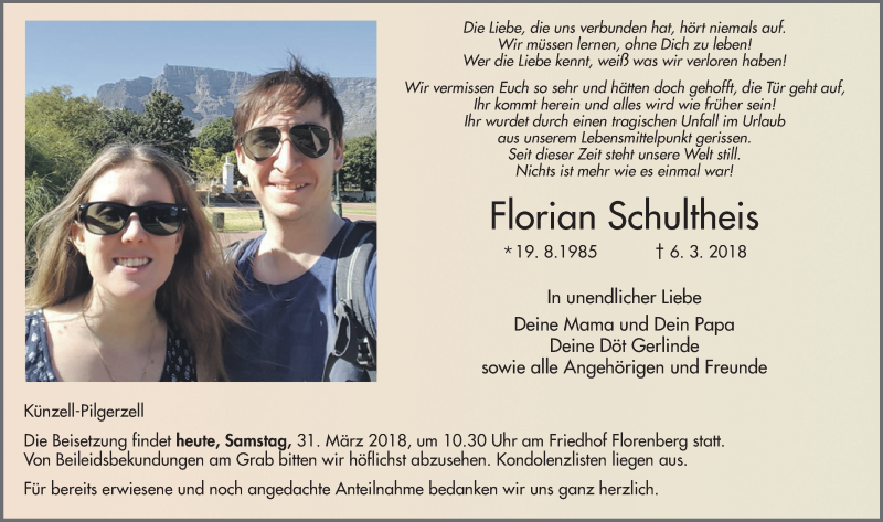 Hier finden Sie alle Traueranzeigen aus der Zeitung, die bisher für Florian Schultheis erschienen sind. Weitere Traueranzeigen, die in der Zeitung erscheinen, werden hier ebenfalls aufgelistet