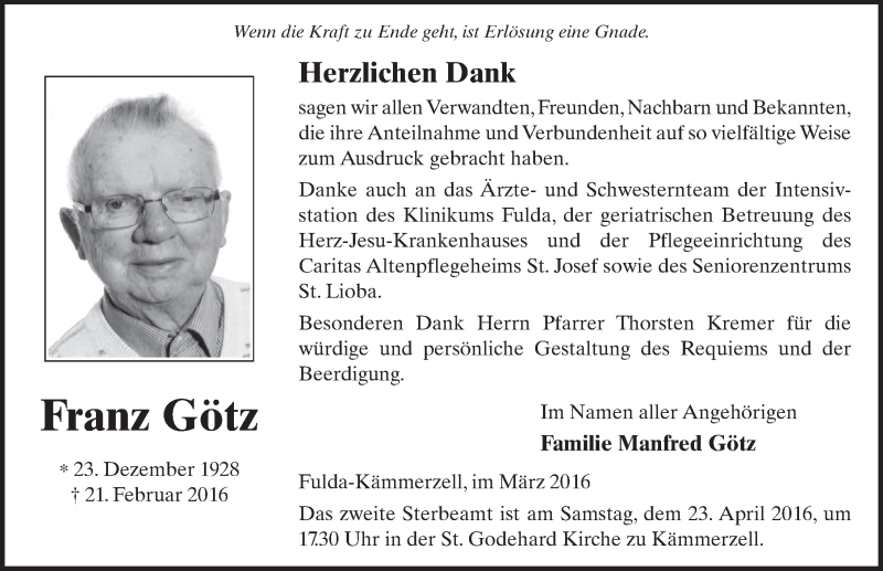 Hier finden Sie alle Traueranzeigen aus der Zeitung, die bisher für Franz Götz erschienen sind. Weitere Traueranzeigen, die in der Zeitung erscheinen, werden hier ebenfalls aufgelistet