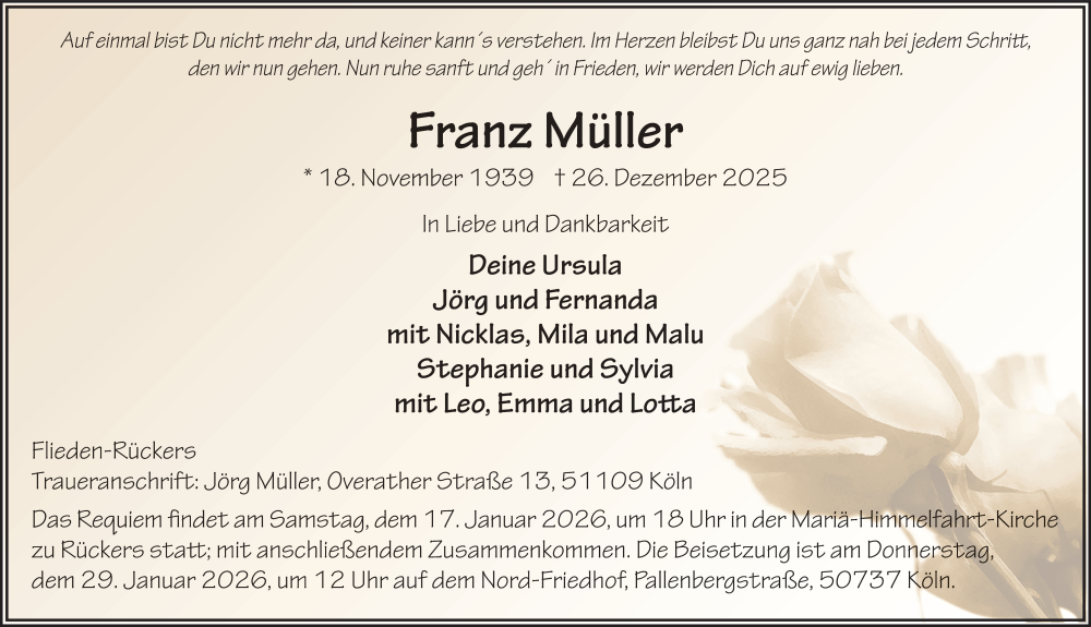 Hier finden Sie alle Traueranzeigen aus der Zeitung, die bisher für Franz Müller erschienen sind. Weitere Traueranzeigen, die in der Zeitung erscheinen, werden hier ebenfalls aufgelistet