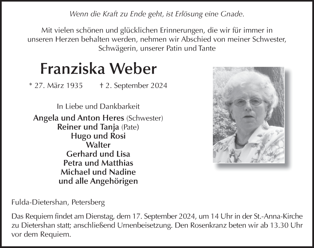 Hier finden Sie alle Traueranzeigen aus der Zeitung, die bisher für Franziska Weber erschienen sind. Weitere Traueranzeigen, die in der Zeitung erscheinen, werden hier ebenfalls aufgelistet