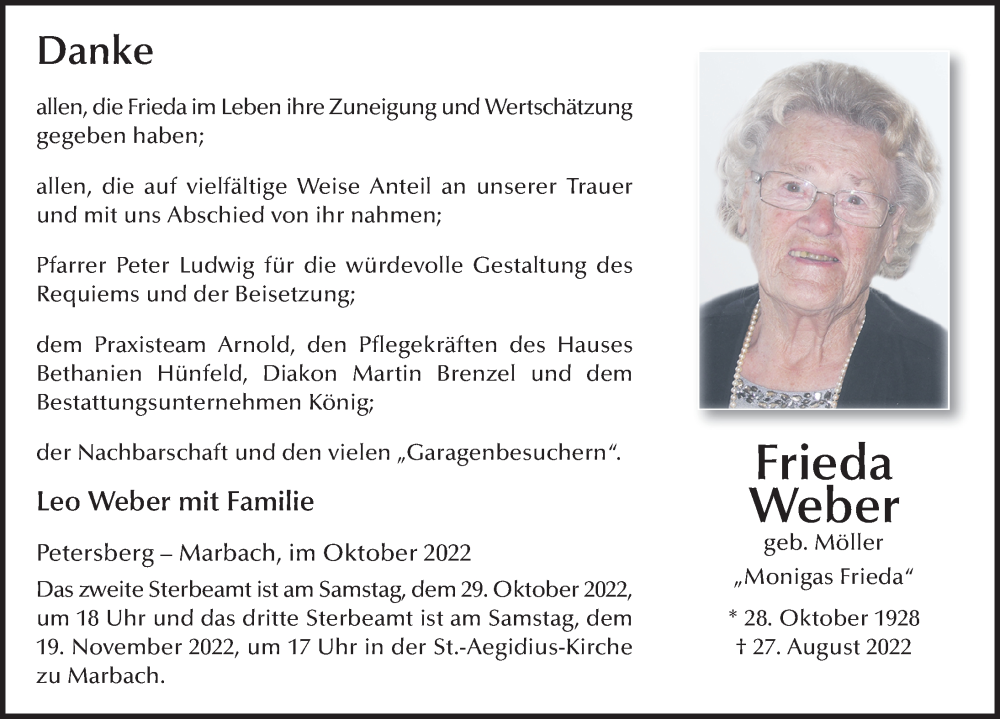 Hier finden Sie alle Traueranzeigen aus der Zeitung, die bisher für Frieda Weber erschienen sind. Weitere Traueranzeigen, die in der Zeitung erscheinen, werden hier ebenfalls aufgelistet