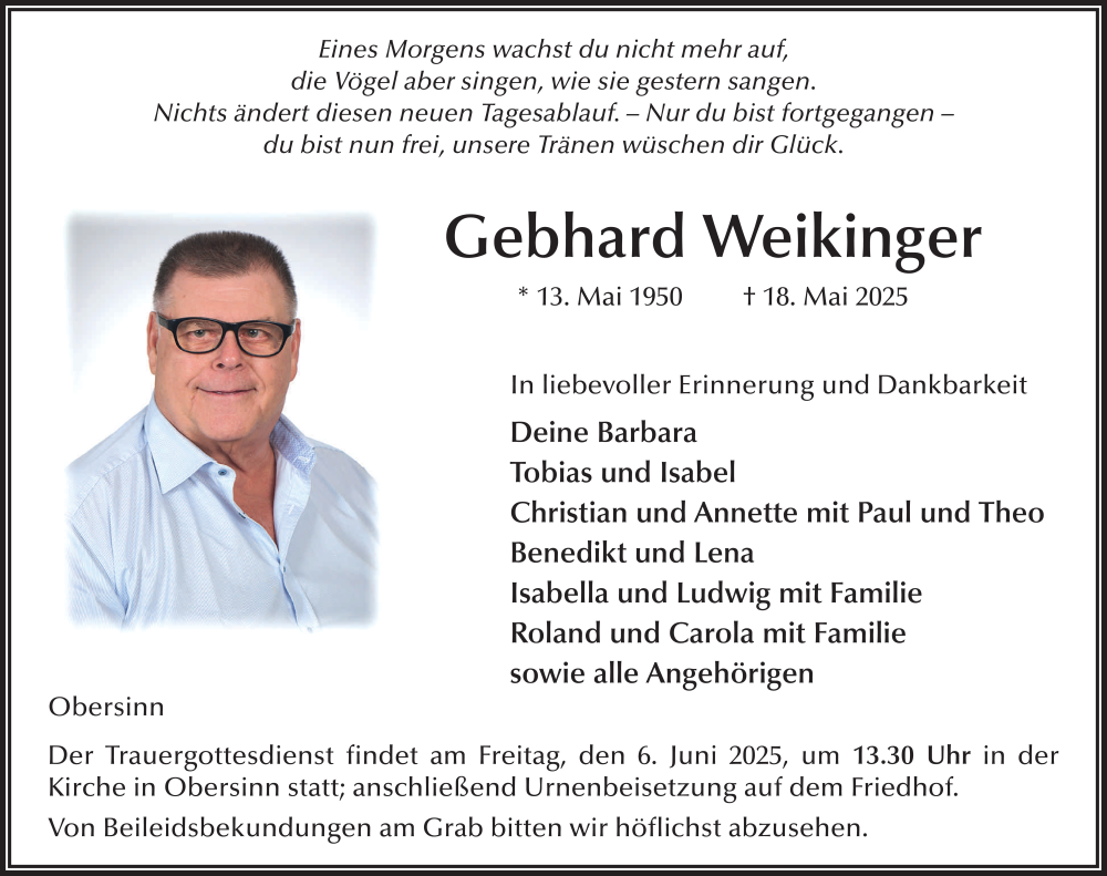 Hier finden Sie alle Traueranzeigen aus der Zeitung, die bisher für Gebhard Weikinger erschienen sind. Weitere Traueranzeigen, die in der Zeitung erscheinen, werden hier ebenfalls aufgelistet