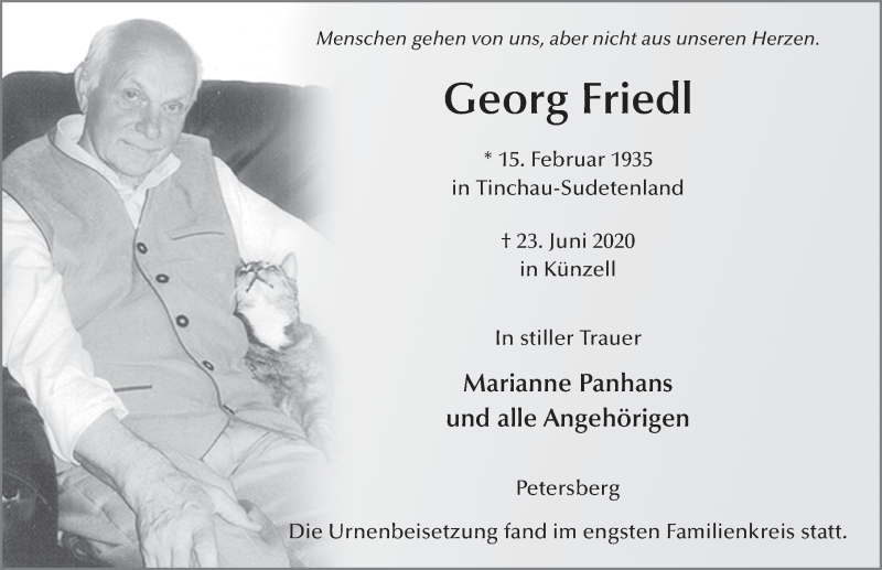 Hier finden Sie alle Traueranzeigen aus der Zeitung, die bisher für Georg Friedl erschienen sind. Weitere Traueranzeigen, die in der Zeitung erscheinen, werden hier ebenfalls aufgelistet