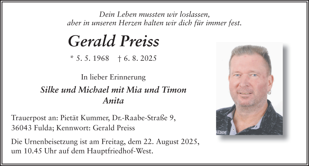 Hier finden Sie alle Traueranzeigen aus der Zeitung, die bisher für Gerald Preiss erschienen sind. Weitere Traueranzeigen, die in der Zeitung erscheinen, werden hier ebenfalls aufgelistet