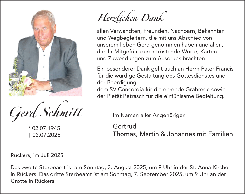 Hier finden Sie alle Traueranzeigen aus der Zeitung, die bisher für Gerd Schmitt erschienen sind. Weitere Traueranzeigen, die in der Zeitung erscheinen, werden hier ebenfalls aufgelistet