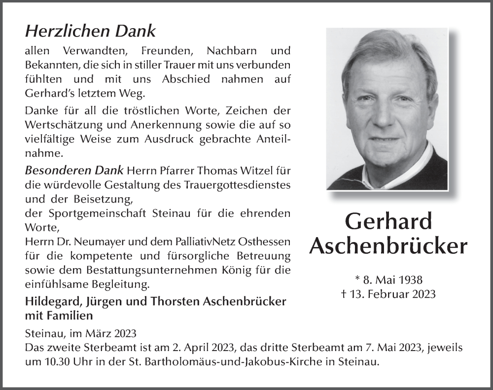 Hier finden Sie alle Traueranzeigen aus der Zeitung, die bisher für Gerhard Aschenbrücker erschienen sind. Weitere Traueranzeigen, die in der Zeitung erscheinen, werden hier ebenfalls aufgelistet