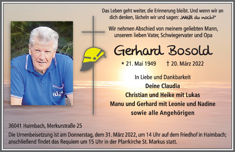 Hier finden Sie alle Traueranzeigen aus der Zeitung, die bisher für Gerhard Bosold erschienen sind. Weitere Traueranzeigen, die in der Zeitung erscheinen, werden hier ebenfalls aufgelistet
