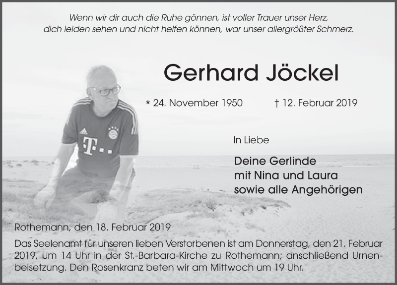 Hier finden Sie alle Traueranzeigen aus der Zeitung, die bisher für Gerhard Jöckel erschienen sind. Weitere Traueranzeigen, die in der Zeitung erscheinen, werden hier ebenfalls aufgelistet