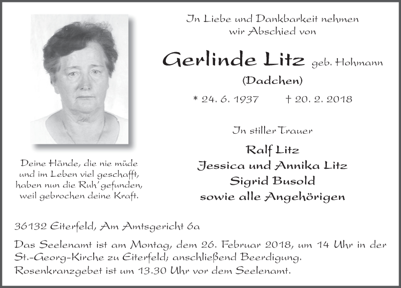 Hier finden Sie alle Traueranzeigen aus der Zeitung, die bisher für Gerlinde Litz erschienen sind. Weitere Traueranzeigen, die in der Zeitung erscheinen, werden hier ebenfalls aufgelistet