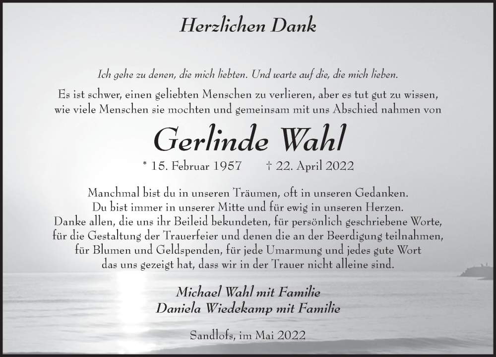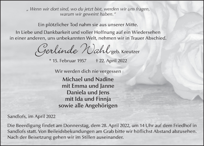 Hier finden Sie alle Traueranzeigen aus der Zeitung, die bisher für Gerlinde Wahl erschienen sind. Weitere Traueranzeigen, die in der Zeitung erscheinen, werden hier ebenfalls aufgelistet