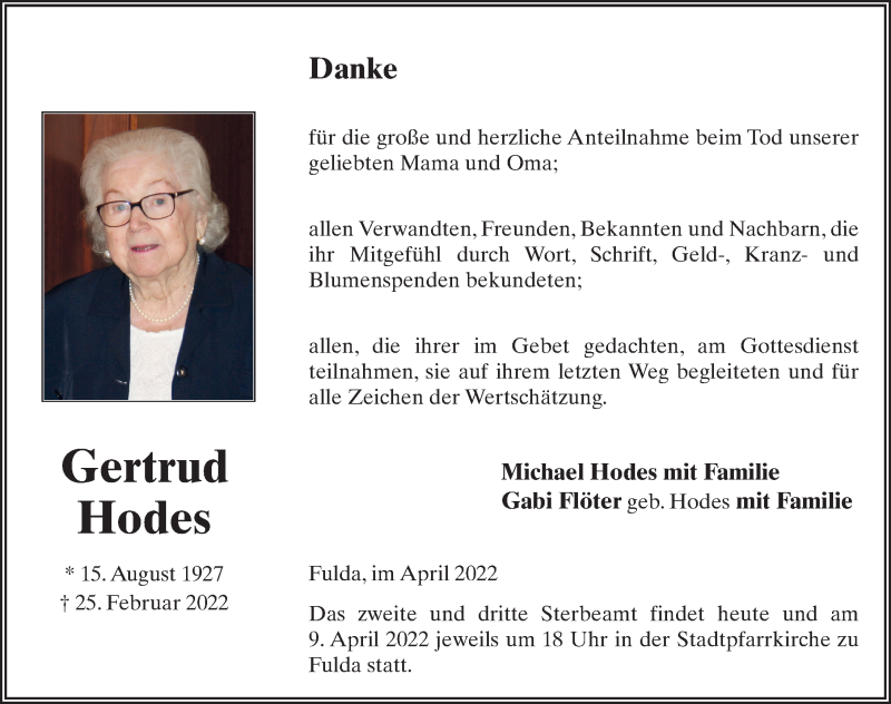 Hier finden Sie alle Traueranzeigen aus der Zeitung, die bisher für Gertrud Hodes erschienen sind. Weitere Traueranzeigen, die in der Zeitung erscheinen, werden hier ebenfalls aufgelistet