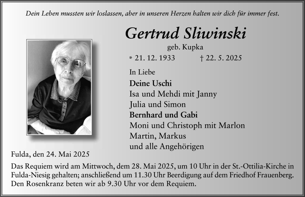 Hier finden Sie alle Traueranzeigen aus der Zeitung, die bisher für Gertrud Sliwinski erschienen sind. Weitere Traueranzeigen, die in der Zeitung erscheinen, werden hier ebenfalls aufgelistet