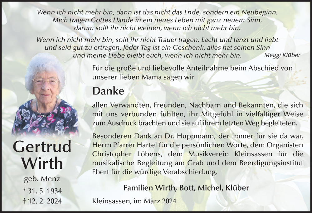 Hier finden Sie alle Traueranzeigen aus der Zeitung, die bisher für Gertrud Wirth erschienen sind. Weitere Traueranzeigen, die in der Zeitung erscheinen, werden hier ebenfalls aufgelistet