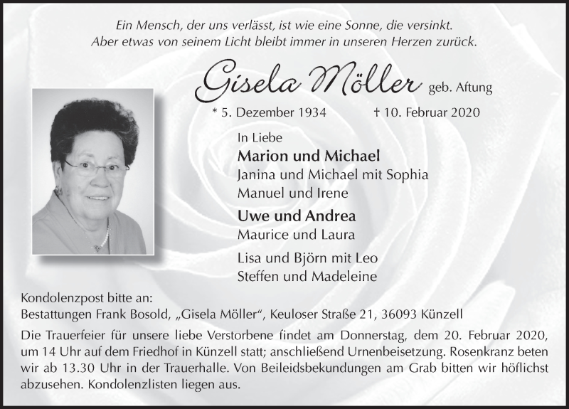 Hier finden Sie alle Traueranzeigen aus der Zeitung, die bisher für Gisela Möller erschienen sind. Weitere Traueranzeigen, die in der Zeitung erscheinen, werden hier ebenfalls aufgelistet