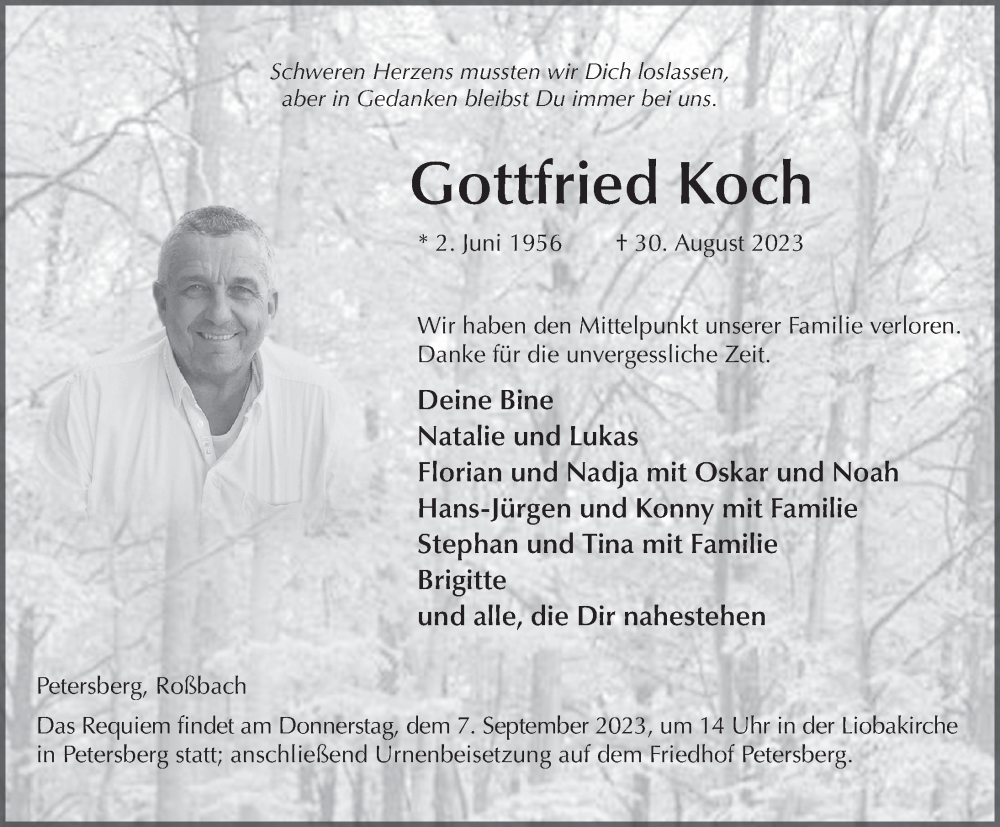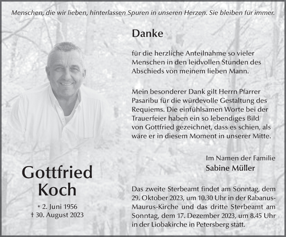 Hier finden Sie alle Traueranzeigen aus der Zeitung, die bisher für Gottfried Koch erschienen sind. Weitere Traueranzeigen, die in der Zeitung erscheinen, werden hier ebenfalls aufgelistet
