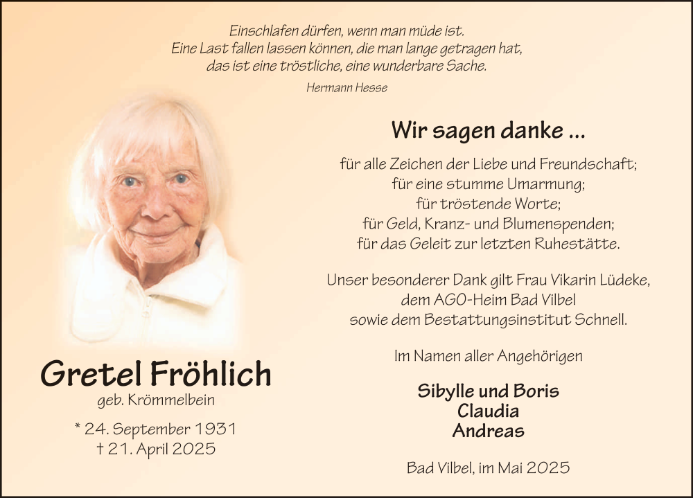 Hier finden Sie alle Traueranzeigen aus der Zeitung, die bisher für Gretel Fröhlich erschienen sind. Weitere Traueranzeigen, die in der Zeitung erscheinen, werden hier ebenfalls aufgelistet