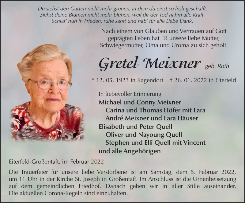 Hier finden Sie alle Traueranzeigen aus der Zeitung, die bisher für Gretel Meixner erschienen sind. Weitere Traueranzeigen, die in der Zeitung erscheinen, werden hier ebenfalls aufgelistet