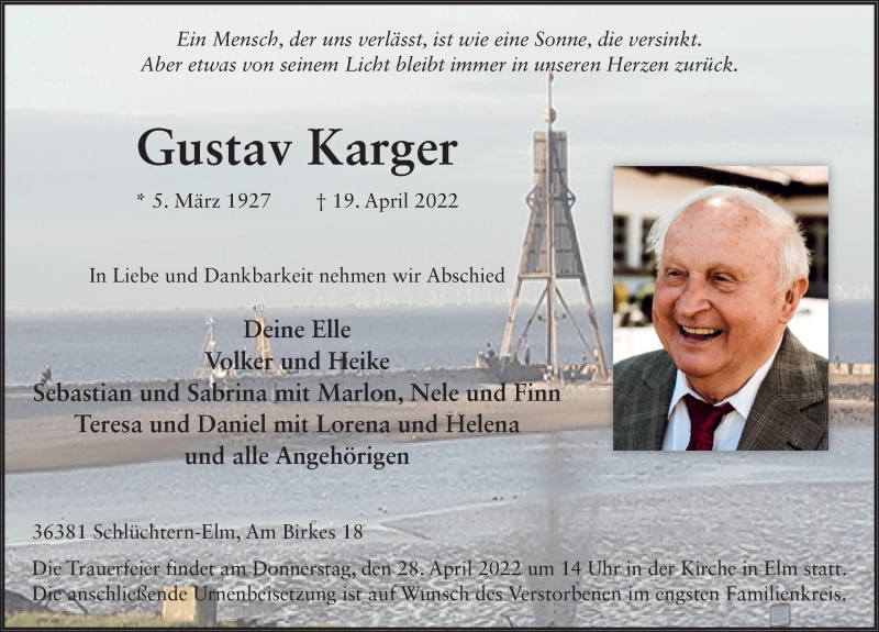 Hier finden Sie alle Traueranzeigen aus der Zeitung, die bisher für Gustav Karger erschienen sind. Weitere Traueranzeigen, die in der Zeitung erscheinen, werden hier ebenfalls aufgelistet