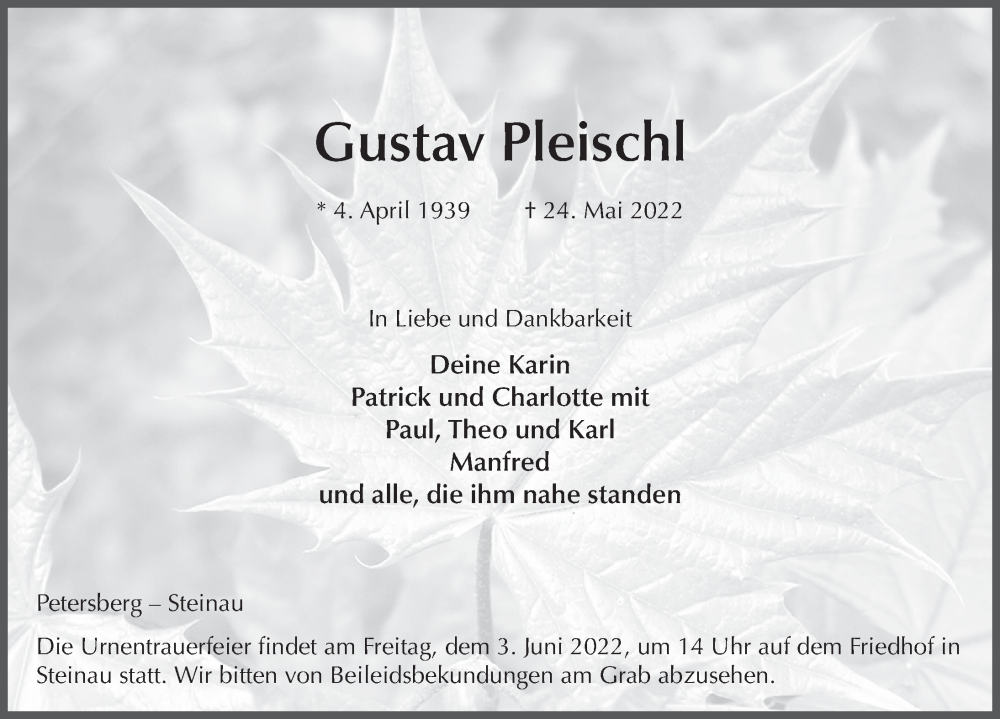 Hier finden Sie alle Traueranzeigen aus der Zeitung, die bisher für Gustav Pleischl erschienen sind. Weitere Traueranzeigen, die in der Zeitung erscheinen, werden hier ebenfalls aufgelistet