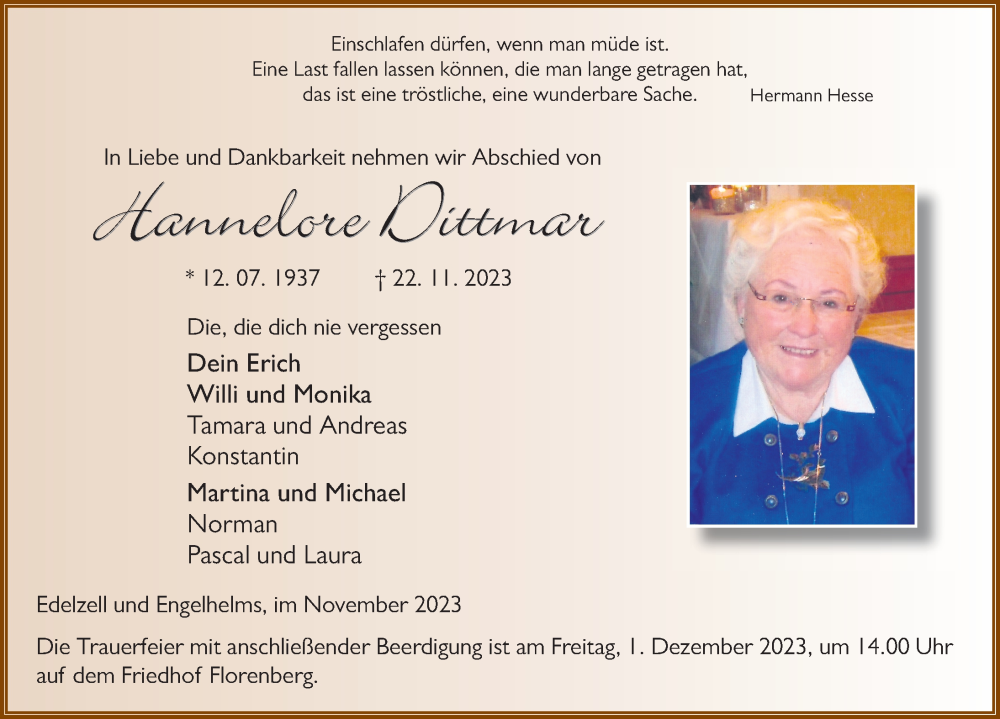 Hier finden Sie alle Traueranzeigen aus der Zeitung, die bisher für Hannelore Dittmar erschienen sind. Weitere Traueranzeigen, die in der Zeitung erscheinen, werden hier ebenfalls aufgelistet