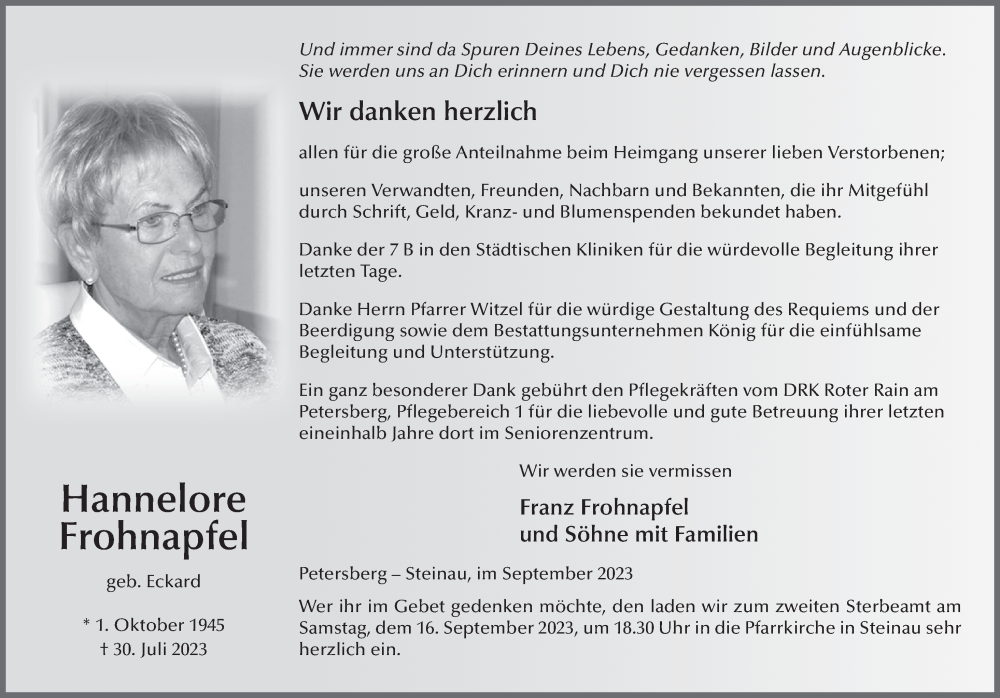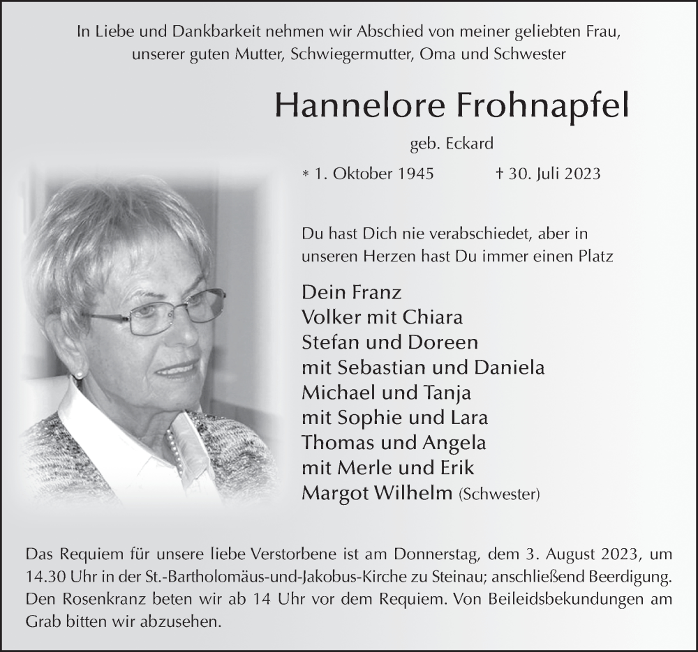 Hier finden Sie alle Traueranzeigen aus der Zeitung, die bisher für Hannelore Frohnapfel erschienen sind. Weitere Traueranzeigen, die in der Zeitung erscheinen, werden hier ebenfalls aufgelistet