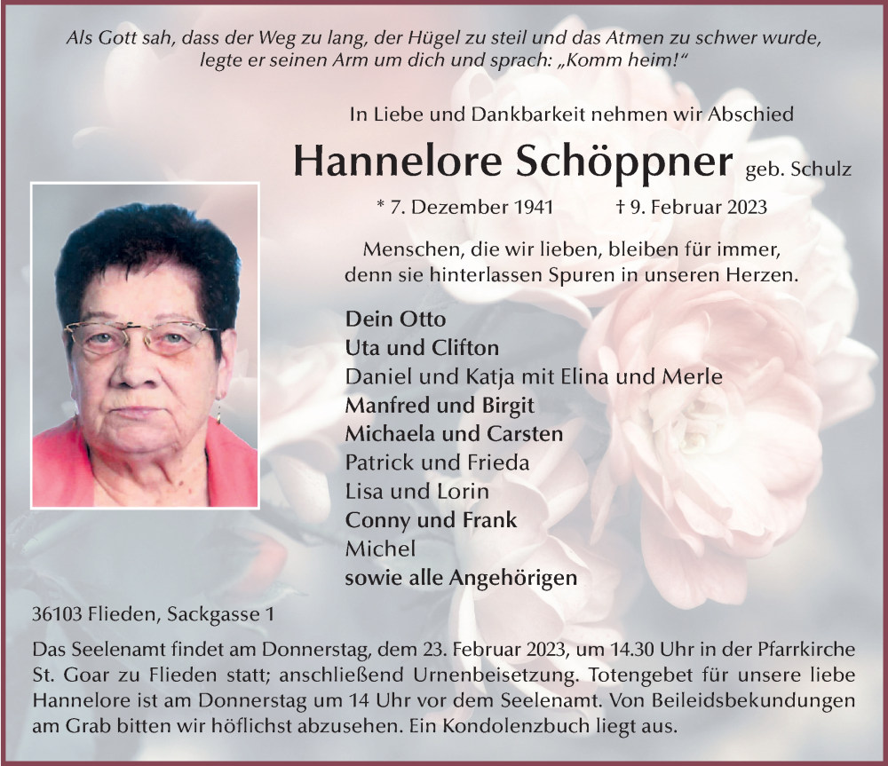 Hier finden Sie alle Traueranzeigen aus der Zeitung, die bisher für Hannelore Schöppner erschienen sind. Weitere Traueranzeigen, die in der Zeitung erscheinen, werden hier ebenfalls aufgelistet