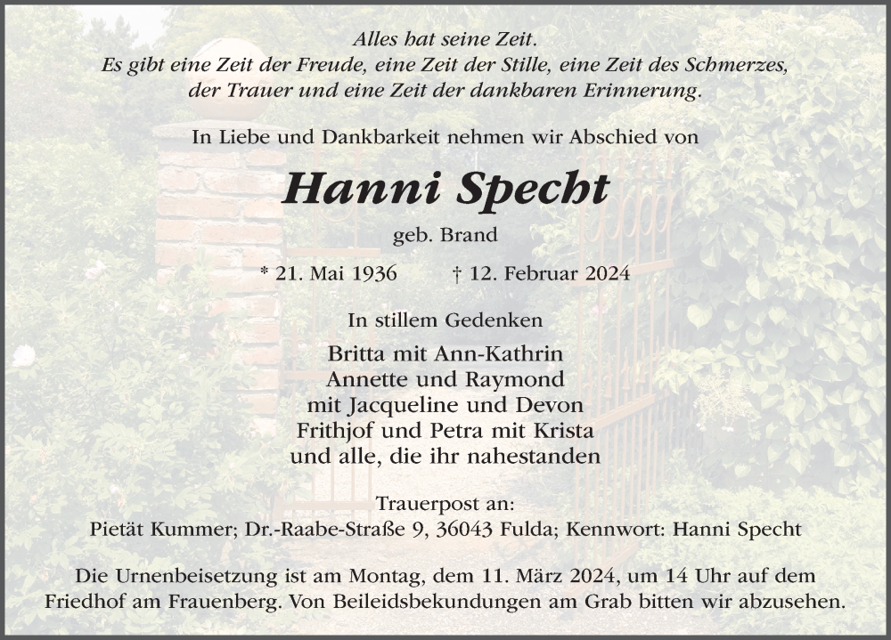 Hier finden Sie alle Traueranzeigen aus der Zeitung, die bisher für Hanni Specht erschienen sind. Weitere Traueranzeigen, die in der Zeitung erscheinen, werden hier ebenfalls aufgelistet