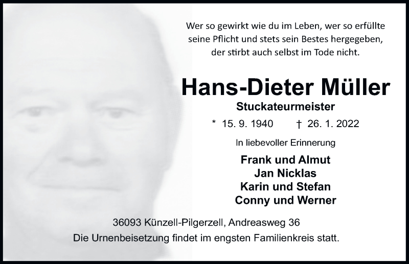 Hier finden Sie alle Traueranzeigen aus der Zeitung, die bisher für Hans-Dieter Müller erschienen sind. Weitere Traueranzeigen, die in der Zeitung erscheinen, werden hier ebenfalls aufgelistet