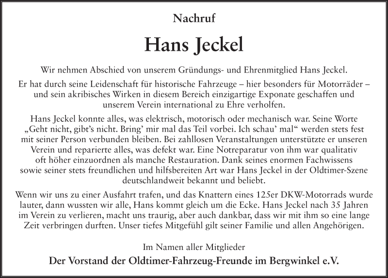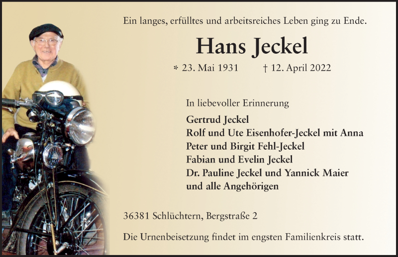 Hier finden Sie alle Traueranzeigen aus der Zeitung, die bisher für Hans Jeckel erschienen sind. Weitere Traueranzeigen, die in der Zeitung erscheinen, werden hier ebenfalls aufgelistet