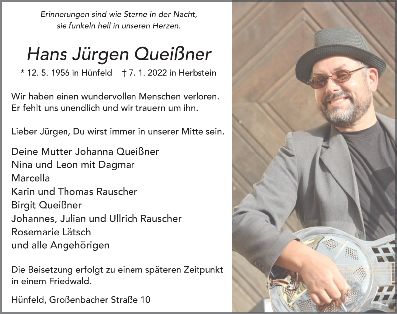 Hier finden Sie alle Traueranzeigen aus der Zeitung, die bisher für Hans Jürgen Queißner erschienen sind. Weitere Traueranzeigen, die in der Zeitung erscheinen, werden hier ebenfalls aufgelistet