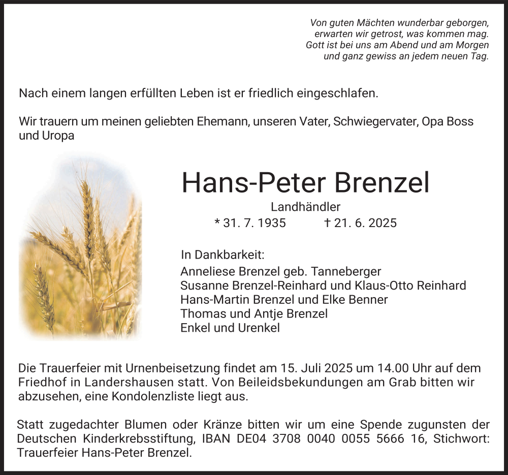 Hier finden Sie alle Traueranzeigen aus der Zeitung, die bisher für Hans-Peter Brenzel erschienen sind. Weitere Traueranzeigen, die in der Zeitung erscheinen, werden hier ebenfalls aufgelistet