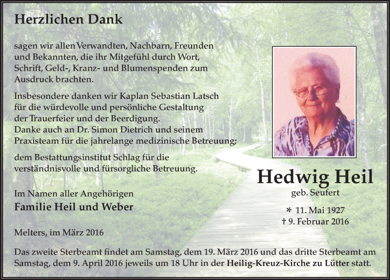 Hier finden Sie alle Traueranzeigen aus der Zeitung, die bisher für Hedwig Heil erschienen sind. Weitere Traueranzeigen, die in der Zeitung erscheinen, werden hier ebenfalls aufgelistet