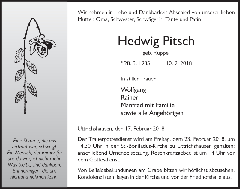 Hier finden Sie alle Traueranzeigen aus der Zeitung, die bisher für Hedwig Pitsch erschienen sind. Weitere Traueranzeigen, die in der Zeitung erscheinen, werden hier ebenfalls aufgelistet