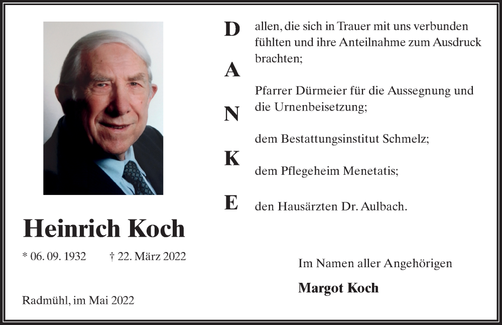 Hier finden Sie alle Traueranzeigen aus der Zeitung, die bisher für Heinrich Koch erschienen sind. Weitere Traueranzeigen, die in der Zeitung erscheinen, werden hier ebenfalls aufgelistet
