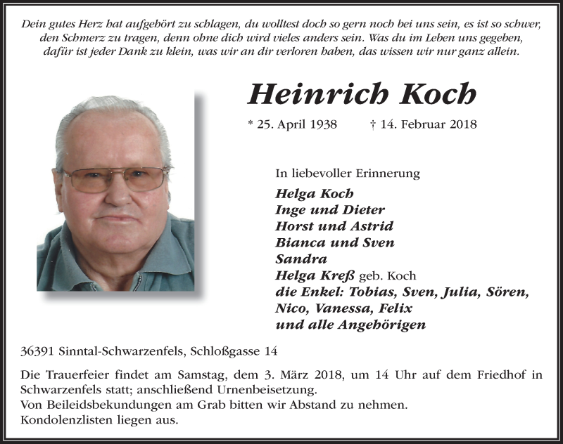 Hier finden Sie alle Traueranzeigen aus der Zeitung, die bisher für Heinrich Koch erschienen sind. Weitere Traueranzeigen, die in der Zeitung erscheinen, werden hier ebenfalls aufgelistet